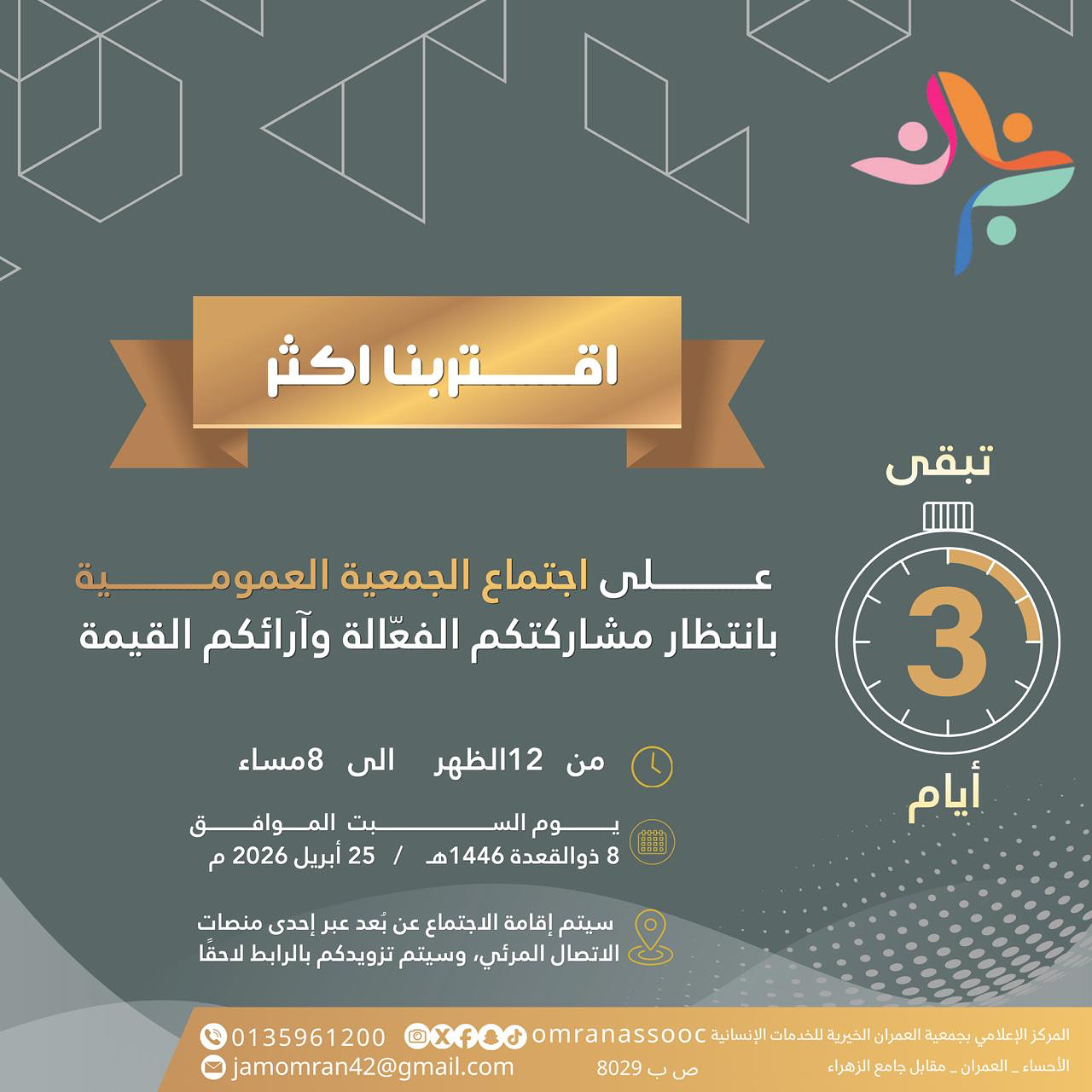 تستعد جمعية العمران الخيرية لعقد اجتماع الجمعية العمومية العادية وغير العادية 2026