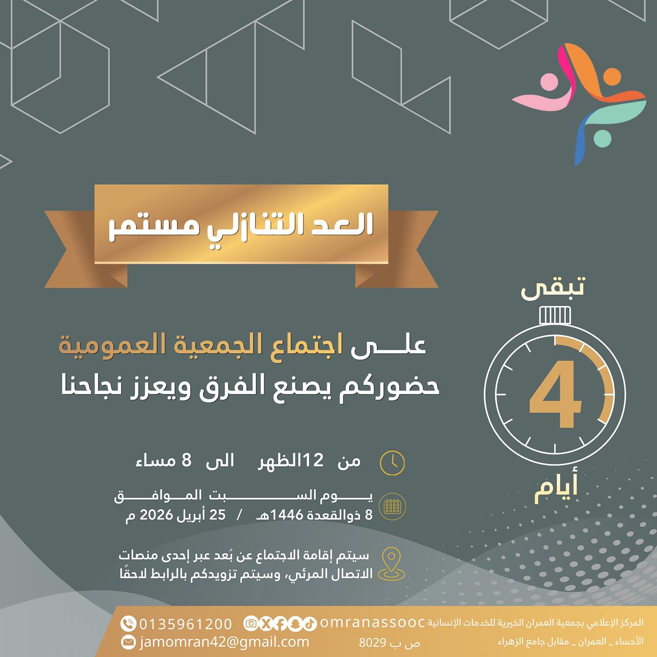 تستعد جمعية العمران الخيرية لعقد اجتماع الجمعية العمومية العادية وغير العادية 2026